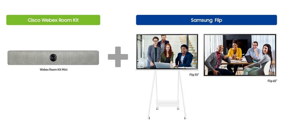 Сопрягая возможности интерактивного флипчарта Samsung Flip и компактного устройства для ВКС и совместной работы Cisco Webex Room Kit Mini, решение Webex + Flip образует чрезвычайно привлекательную платформу для небольших креативных команд, настроенных на сочетание офисной и удалённой работы.