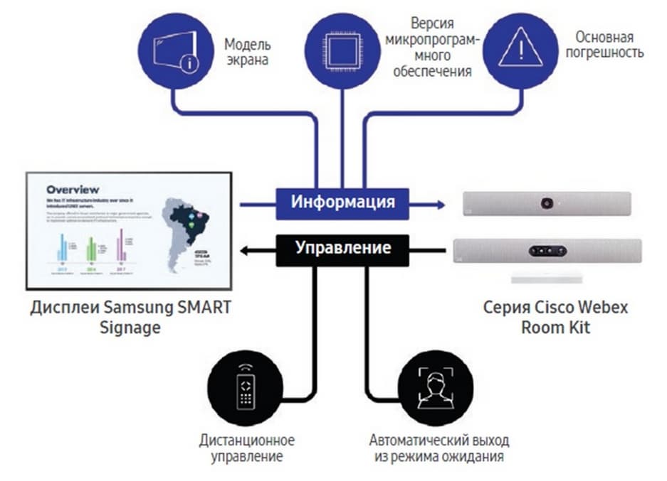 Рис. 5. Умное управление дисплеями реализуется за счёт синхронизации картинки на дисплее Samsung с кодеком, используемым для формирования изображения ВКС-системой Cisco.