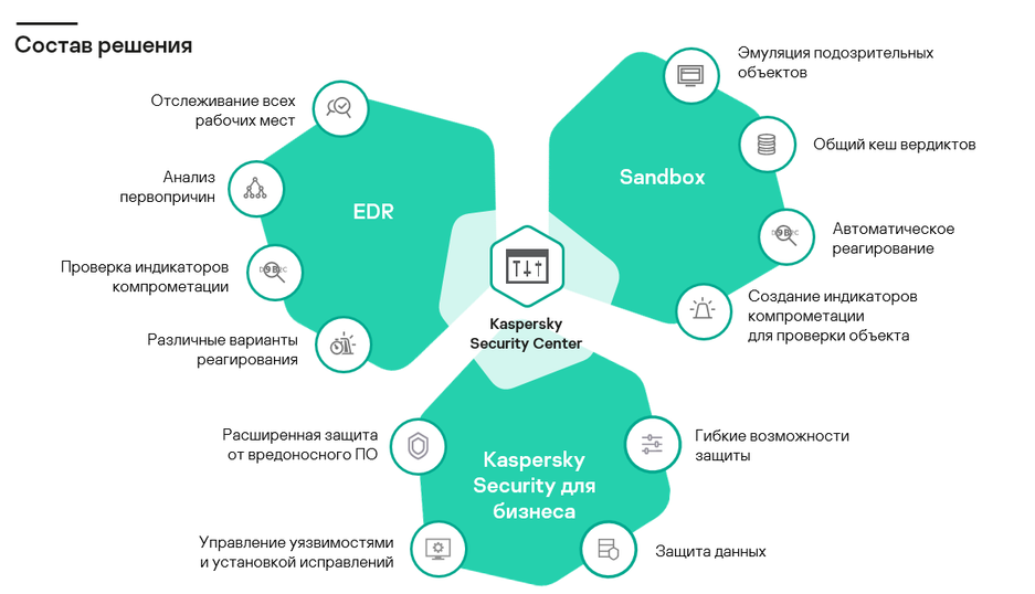 Первый — это традиционная защита рабочих станций и серверов Kaspersky Security для бизнеса. Она представляет собой расширенное EPP-решение, которое и «держит» первый удар при отражении кибератак.