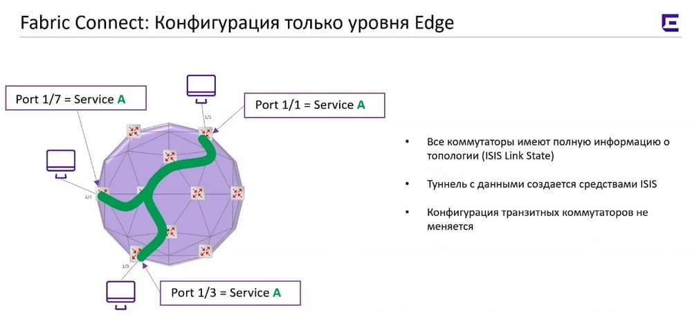 Чтобы между ними пробросить какой-то сервис, условный VLAN, необходимо порт, который ведет к конечному устройству отдать в некий сервис Service А (вместо А должна быть какая-то цифра, все сервисы в фабрике пронумерованы) и необходимо сделать идентичную команду на противоположной стороне фабрики порт 1/3 отдать в Service A, т.е. Port 1/3=Service A. После этого средствами ISIS автоматически туннель пробросится по всей сети. Фабрика может как угодно большая: два коммутатора или 200 или 2000 коммутаторов. Здесь важно не затрагивается конфигурация транзитных узлов, т. о. такое добавление сервисов можно осуществлять и в рабочее время. Если к этому сервису нужно подключить еще кого-то, надо сделать те же самые «движения», например порт 1/7 на другом коммутаторе отдаем тоже в Service А и туннель автоматически достраивает у себя новую ветку. Делается это автоматически с помощью протокола ISIS, который старается прокладывать эти маршруты по кратчайшему пути, он занимается также балансировкой трафика внутри фабрики, а также перестроением туннелей в случае аварий. Здесь все значительно упрощается с точки зрения администрирования.