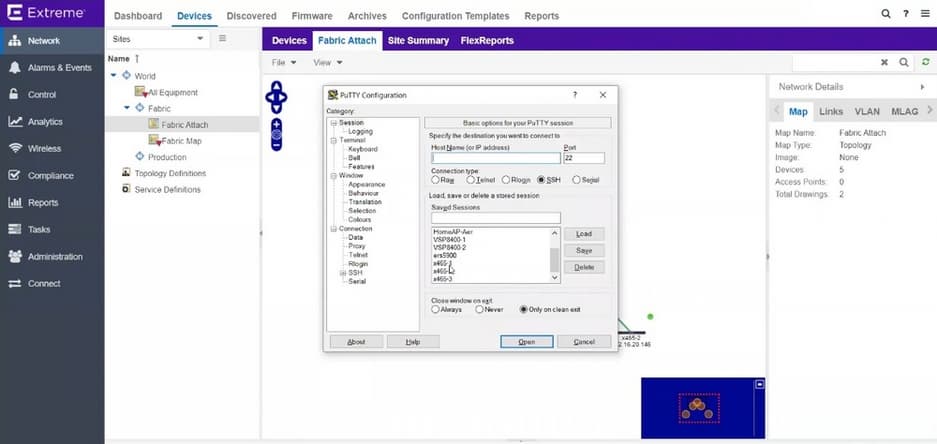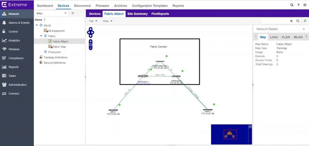 Теперь перейдем к демонстрации Fabric Connect. В нашей системе есть карта Fabric Map, в котором есть три коммутатора в большой фабрике Fabric Connect. Это может быть сколь угодно большая фабрика или фабрика только их одного коммутатора. Здесь есть два коммутатора Summit, которые не входят в фабрику, но подключены к ней по технологии Fabric Attach: 465-1 и 465-2, они подключены к разным коммутаторам фабрики и еще к этим коммутаторам доступа и к ним подключены две виртуальные машины и сейчас попробуем между этими машинами пробросить VLAN, т.е. пробросить новый сервис, при этом никак не затрагивая конфигурацию Fabric Connect.