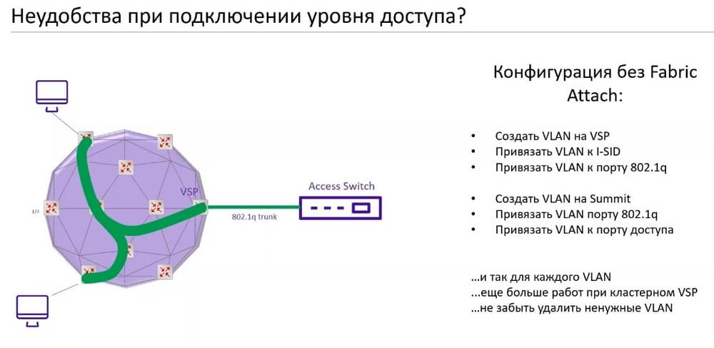 Все было бы хорошо и можно было бы здорово полностью построить сеть от ядра до доступа на технологиях Fabric Connect, но бывает так что на уровне доступа стоят простые коммутаторы, которые не поддерживают ни аппаратно, ни программно технологию Fabric Connect.