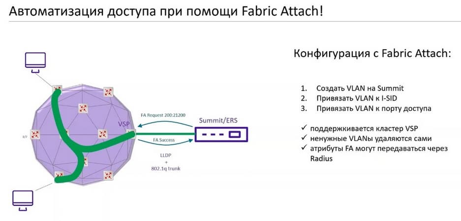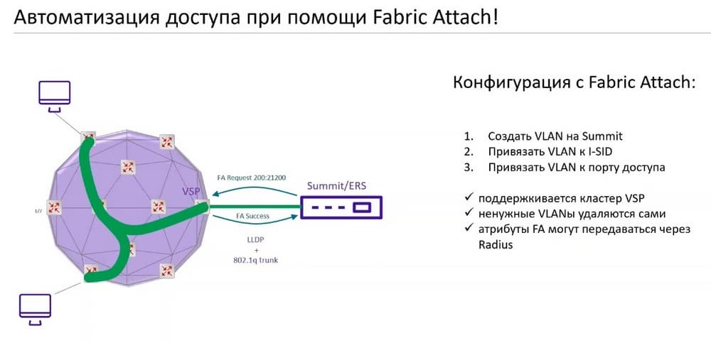 Первый вариант использования Fabric Attach - это ручная конфигурация Summit либо IRS. У нас те и другие коммутаторы поддерживают технологию Fabric Attach, а второй вариант - это использование системы контроля доступа. Система контроля доступа может назначать различные политики на подключение пользователей, может назначать VLAN. И в том числе система контроля доступа через Radius-атрибуты может отдавать в коммутатор доступа номер сервиса условный I-SID. Эти три шага: создание VLAN, привязка VLAN к I-SID и привязка пользовательского порта к VLAN может быть автоматизирована при помощи системы контроля доступа Extreme Control.