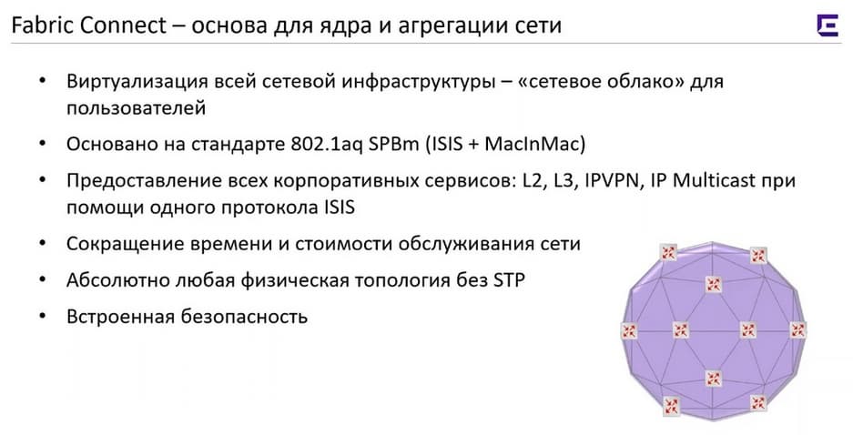 Сегодня речь пойдет о Fabric Attach и Fabric Connect как едином механизме. Fabric Connect – это основной базис для построения географически разнесенной корпоративной сети. Фабрика – это виртуализация сетевой инфраструктуры, внутри этой фабрики работает протокол SPBm, он описан в отдельной ветке стандартов. Внутри на коммутаторах при включении SPBm включается протокол ISIS. Инженеры расширили возможности ISIS так что на одном этом протоколе можно реализовать все корпоративные сервисы: проброс L2, по сути, проброс VLAN, маршрутизация между IP-подсетями, создание IPVPN, маршрутизация и коммутация IP Multicast.