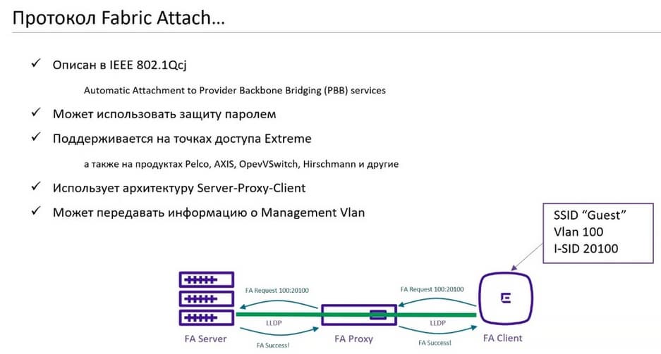 Технология Fabric Attach использует архитектуру Server-Proxy-Client. Что это значит? FA Client - это устройство, на котором мы начинаем запрашивать сервис. Все точки доступа Extreme тоже поддерживают технологию Fabric Attach. И мы условно можем на точке доступа сказать: "Мне нужен такой-то VLAN и такой-то сервис". На точке доступа мы это можем централизованно сконфигурировать через контроллер. Например, мы создаем новый SSID. Пользователи, которые подключаются к этому SSID должны «проваливаться» в VLAN 100, а VLAN 100 где-то должен попадать в сервис 20100. Мы это конфигурируем на точке доступа. Что происходит дальше? FA Client передает этот запрос ближайшему коммутатору FA Proxy. Так же, как и любой другой Proxy, в IT мире FA Proxy собирает запросы от клиентов, как-то их агрегирует. И если на Proxy нет информации о том, что клиент спрашивал, он этот запрос просто перенаправляет в сторону сервера. И у нас есть FA Server. В нашей терминологии получается FA Server - это устройство, которое поддерживает позади себя большую фабрику Fabric Connect. FA Proxy обычно это наш коммутатор доступа Summit или IRS. А FA Client в большинстве случаев является точкой доступа.