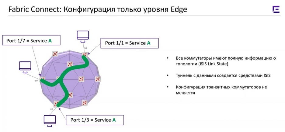 Одним из свойств Fabric Connect является то, что для прокладки новых сервисов нет необходимости переконфигурировать всю сеть, для этого нужно переконфигурировать только уровень условного доступа, т.е. границы этой фабрики.