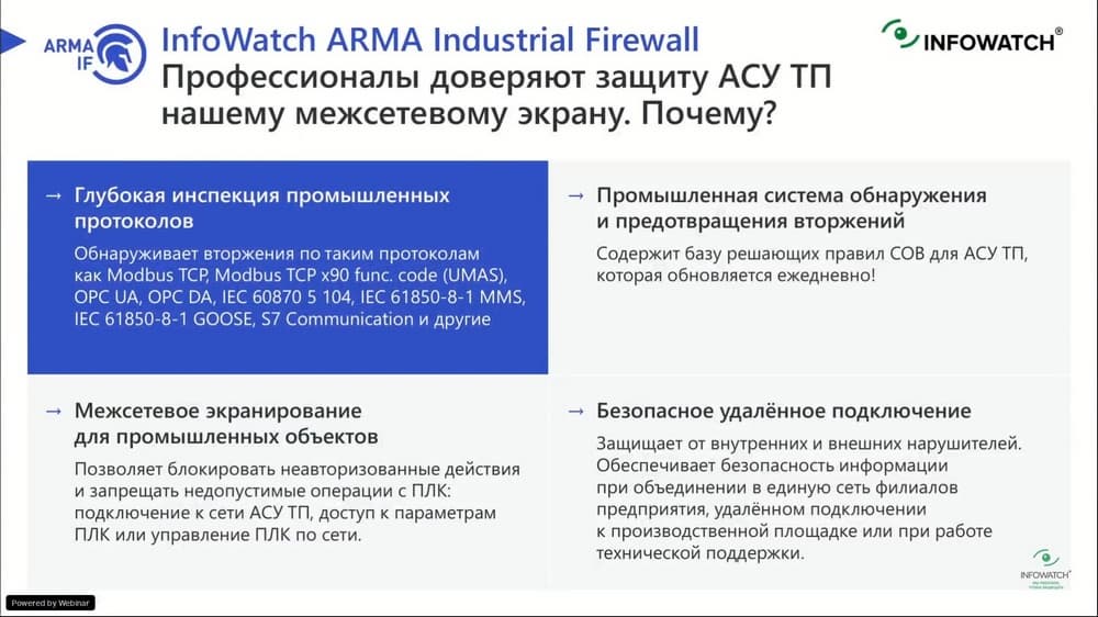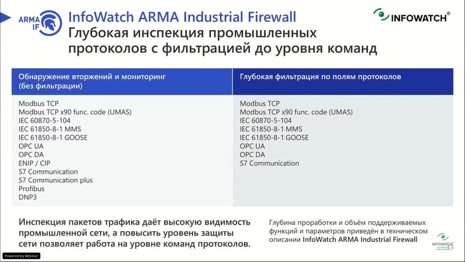 На этом мероприятии будет разобрано, как эти возможности реализуют промышленные межсетевые экраны, например, InfoWatch ARMA Industrial Firewall. Подробно будет рассказано про разбор промышленных протоколов, как можно контролировать сетевой трафик с ИТ- и ОТ-систем, чтобы построить систему ИБ АСУ ТП передового уровня. Цель – кибербезопасность АСУ ТП без нарушения непрерывности производственных процессов.