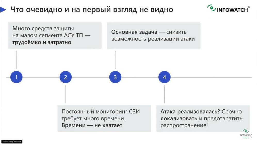 Четвертый момент говорит о том, что, к сожалению, не все атаки можно предотвратить. Есть случаи, когда действует скоординированная группировка профессионалов, которая очень долго готовит свою атаку, обследует объект атаки, комбинирует сложный сценарий с использованием средств социальной инженерии и в то же время технических средств для проникновения и реализации атаки. В этом случае, если атака всё-таки удалась, то первостепенной задачей становится максимально быстрое обнаружение этого проникновения и локализация этой атаки для того, чтобы вредоносное воздействие не распространилось дальше по сети.