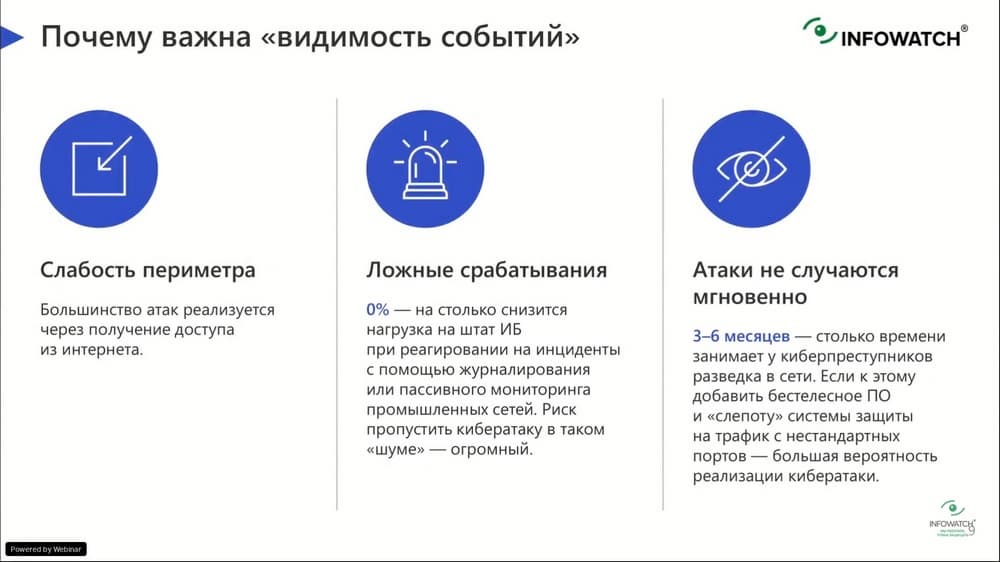 Почему так важна видимость событий? К сожалению, большинство атак в настоящее время реализуется через получение доступа из Интернета. И, если мы не видим всех устройств в защищаемой сети, и не видим, что к чему подключено, и каким именно образом, и что где-то есть доступ в Интернет, который должным образом не защищен, то, мы не можем обеспечить защиту объекта на должном уровне. Теперь про ложные срабатывания. К сожалению, большинство средств защиты дает большое количество как истинных срабатываний, так и ложных. И поэтому, если есть некий центр управления, который позволяет акцентировать внимание специалистов только на истинных срабатываниях, которые представляют собой наибольшую важность, и позволяют работать сними оперативно и своевременно, это значительно повышает общий уровень защищенности АСУ ТП системы. Атаки не случаются мгновенно. Примерно от трех до шести месяц занимает разведка у киберпреступников, нацеленных на АСУ ТП. И, если мы добавляем некую слепоту систем защиты, или добавляем действия по неким нестандартным портам, то высока вероятность реализации такой атаки.
