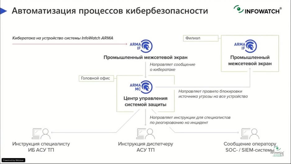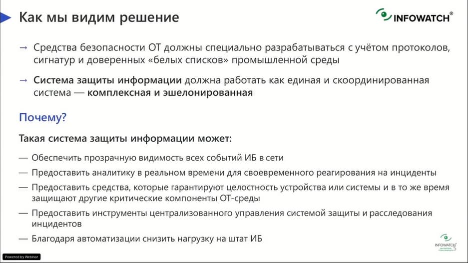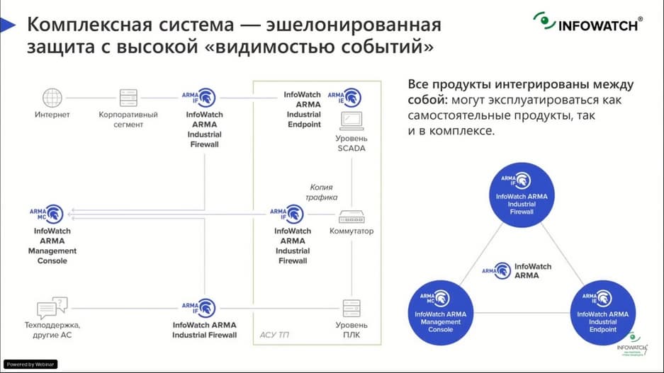 Сами средства защиты на таких площадках должны специально разрабатываться с учетом промышленных протоколов, коммуникаций и служб, которые являются проприетарными для этих производственных сред. Для того, чтобы средство защиты охватывало всю OT-сеть, а не состояло из разрозненных решений, необходимо проектировать защиту на самых базовых уровнях промышленной сети. Один из таких подходов, это создание комплексной сегментированной и многоуровневой системы безопасности. Система должно обеспечивать видимость всех устройств в том сегменте, который мы защищаем, должна предоставлять оперативную аналитику в реальном времени для того, чтобы офицеры ИБ могли принимать своевременные решения. Должна позволять управлять правилами и политиками безопасности, которые будут гарантировать целостность устройств или систем, которые необходимо защитить, и в то же время защищать критические компоненты технологической сети. Исходя из всего вышесказанного, компания InfoWatch и построила программный комплекс InfoWatch ARMA, который призван защищать АСУ ТП системы.