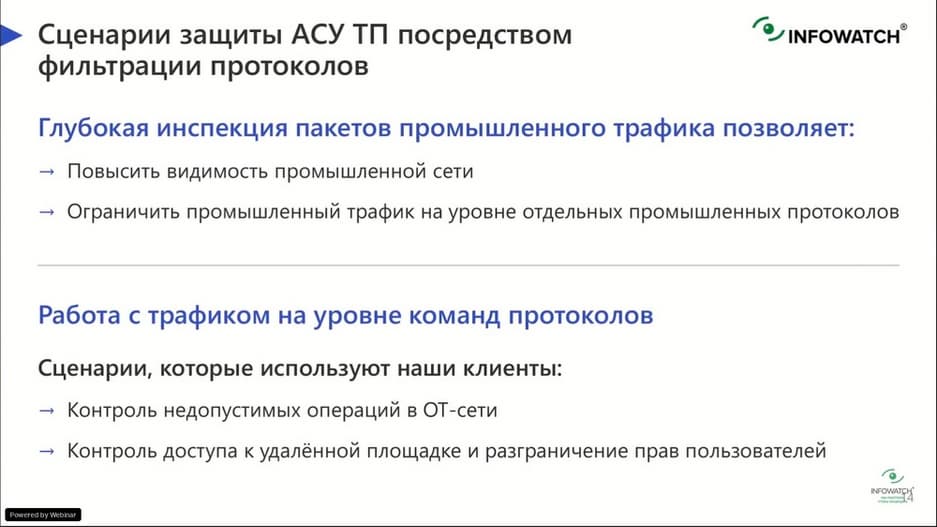 - Промышленная кибербезопасность на практических кейсах. Как повысить видимость сетей, используя разбор протоколов до конкретных команд, запретить любые действия с ПЛК и даже настроить автоматическую блокировку вредоносных пакетов в трафике от источника угрозы.