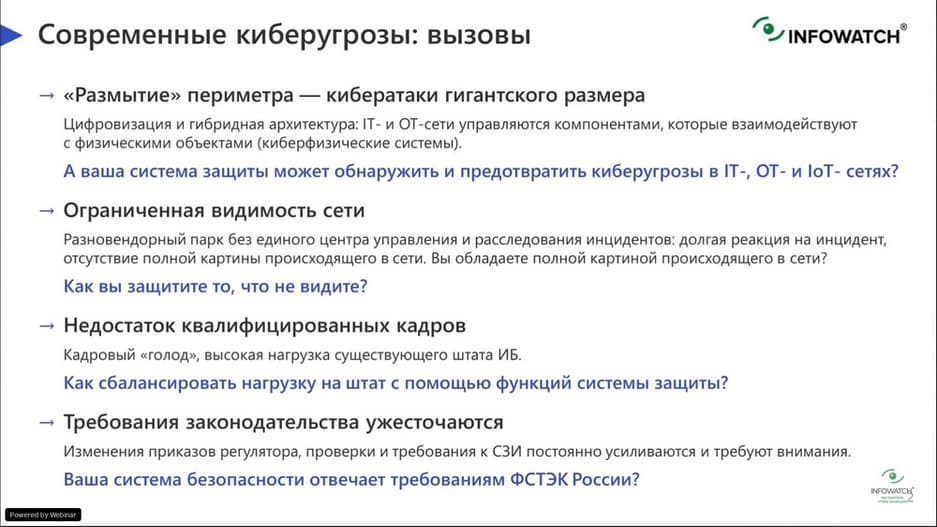 Сегодняшнее мероприятие проведет Елена Викулина, менеджер по продукту InfoWatch ARMA. И начала она свое выступление с тех вызовов, с которыми приходится сталкиваться вендору – компании InfoWatch и заказчикам, которым нужна защита от разнообразных атак.
