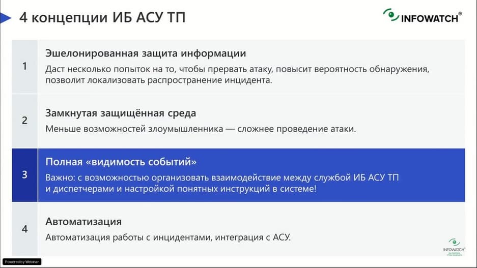 Третья концепция - полная видимость событий. Когда мы видим сеть, видим подключенные средства защиты, видим события, и можем оперативно на них реагировать. И, когда мы организуем взаимодействие службы ИБ и службы диспетчеров на производстве с точки зрения слаженных действий по обработке возникающих инцидентов.