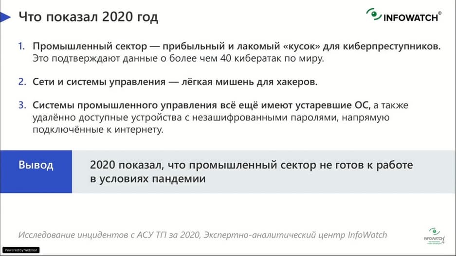 Что показал 2020 год? Росло количество атак на промышленный сектор. Особенно когда во время пандемии потребовалось организовывать удаленное подключение к промышленным площадкам. К сожалению, далеко не все сети были готовы к этому. Не везде должным образом была организована защита промышленных сетей. Что и привело к такому показателю, как более 40 кибератак в мире на промышленные системы.