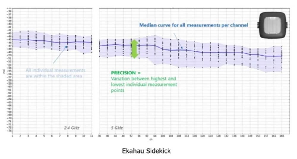 Как видно на графике, всё очень сильно отличается от канала к каналу. Это справедливо для всех устройств, в частности, и для клиентских устройств. Этот бешенный разброс в десятки раз напоминает, что, если вы два раза пройдетесь по одному и тому же месту, вы получите разные результаты с одним и тем же человеком, с одним и тем же ноутбуком, с одним и тем же адаптером. Ни о каком постоянстве результатов речь идти не может. Все адаптеры разные. А если вы в пространстве хоть чуть-чуть спозиционировать адаптер, то можно увидеть, что у антенны есть диаграмма направленности, и вы будете получать другие цифры. Напротив, у Ekahau Sidekick разброс намного меньше.