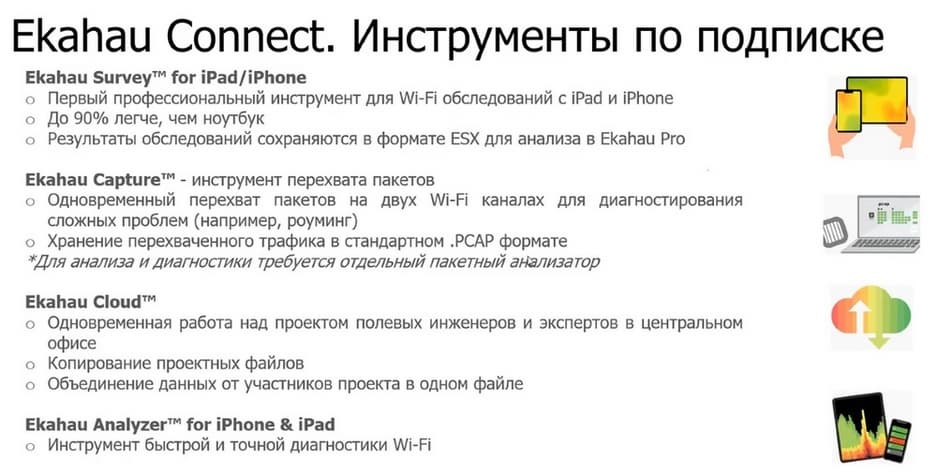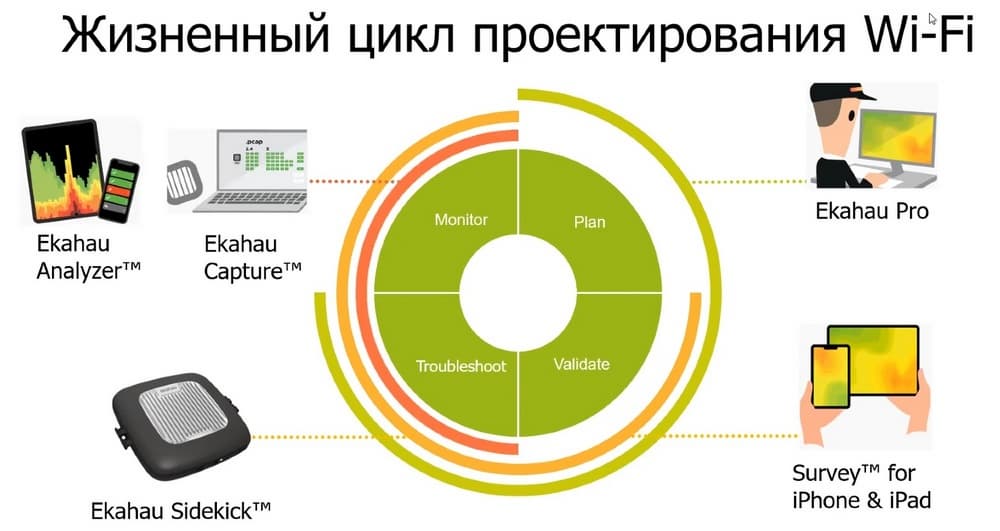 В планировании используется софт Ekahau Pro, Survay применяется при валидации и поиске проблем. У вендора есть отдельный софт для iPad и iPhone. С его помощью можно производить наблюдение за сетью. Ekahau Sidekick - это аппаратный модуль к Ekahau Pro, позволяющий «слушать во всех направлениях» и получать данные о спектре сигналов. И на этапе troubleshoot и наблюдения поможет приложение Ekahau Analyzer. Также есть приложение Ekahau Capture, предназначенное для компьютеров (PC или Mac) и в нем вы можете собирать с помощью Ekahau Sidekick все необходимые пакеты.