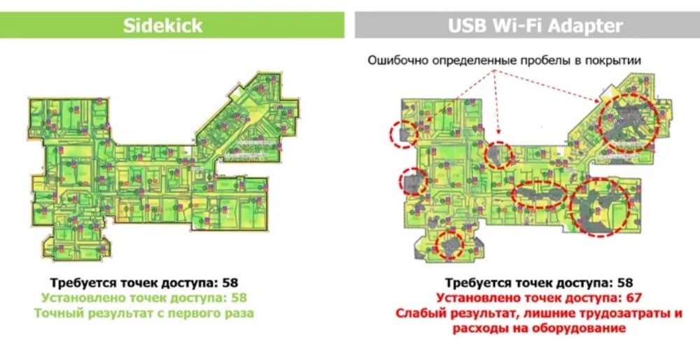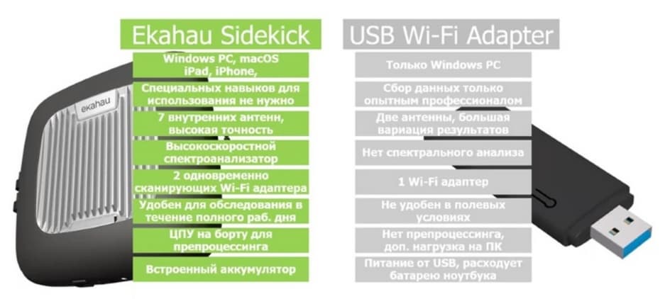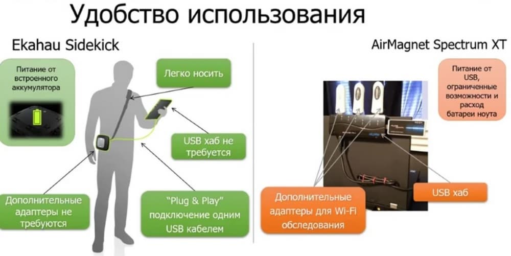 Никита Зайко, руководитель группы техподдержки, компания «Марвел Дистрибьюция» добавил, что USB Wi-Fi адаптеры изначально не разрабатывались для работы в полевых условиях для проведения Wi-Fi обследований. Скорее это было просто дополнением, поскольку тогда ноутбуки еще не имели встроенных Wi-Fi адаптеров, но использовались такие USB «палочки». А Ekahau Sidekick фактически специально было разработано для проведения разнообразных Wi-Fi обследований.