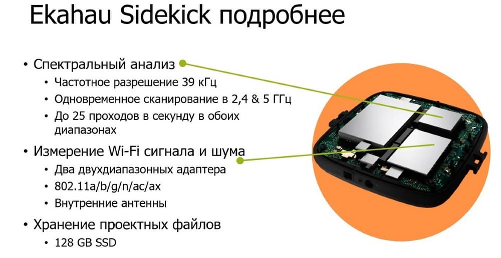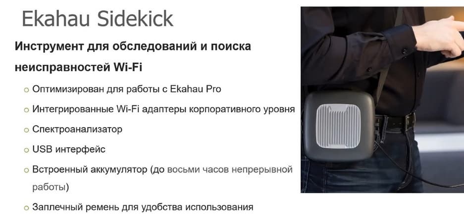 Ekahau Sidekick – это инструмент для обследования и поиска неисправностей Wi-Fi сети. Ekahau Sidekick используется вместе с Ekahau Pro. Внутри есть чувствительные Wi-Fi-адаптеры и хорошие откалиброванные антенны.