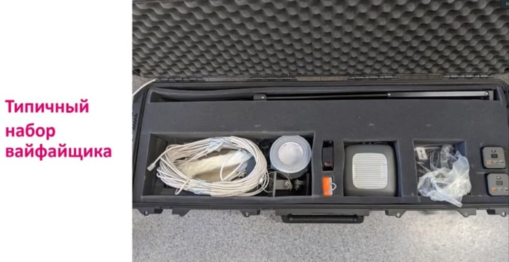 Это устройство на базе Wi-Fi. Среди прочих возможностей, с его помощью можно создать сервер для получения трафика и пингования. И в автономном режиме можно организовать стойку и на нее поставить точку доступа. Получается так называемая «палка», к которой подсоединяются точки доступа с помощью специального крепежа. (Крепить можно самыми разными способами, в том числе при помощи самого обычного скотча.) Также в чемодане есть сами точки доступа и уличный лазерный дальномер, с помощью которого можно откалибровать карты.
