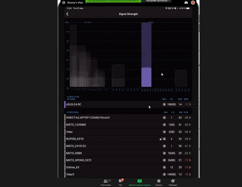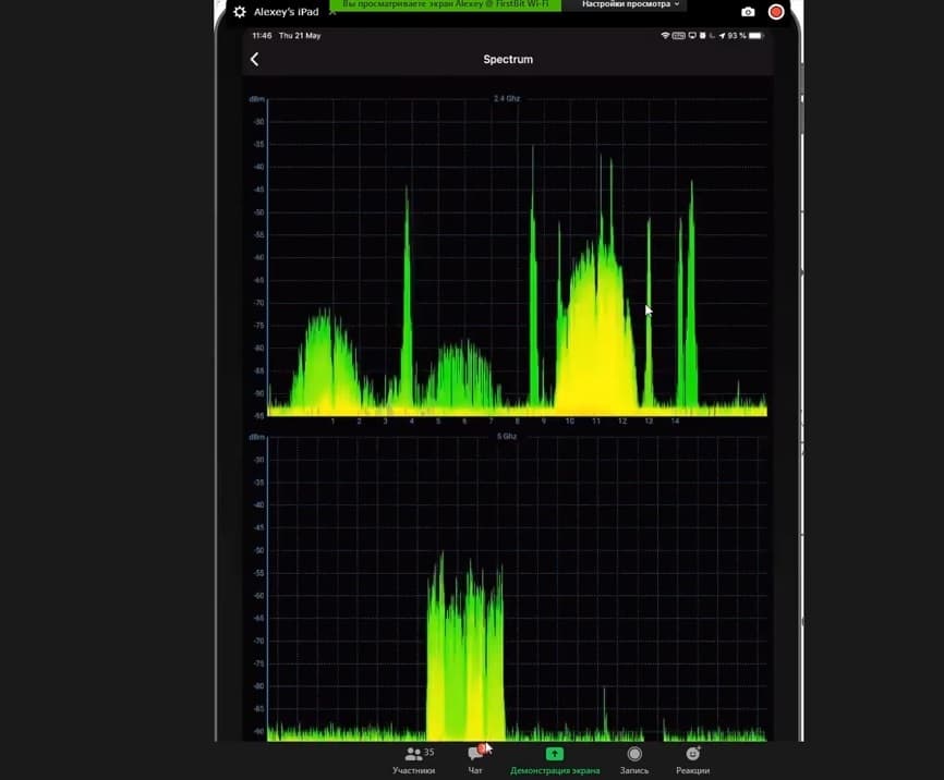 Здесь в режиме реального времени можно видеть спектр 2,4 и 5 ГГц.