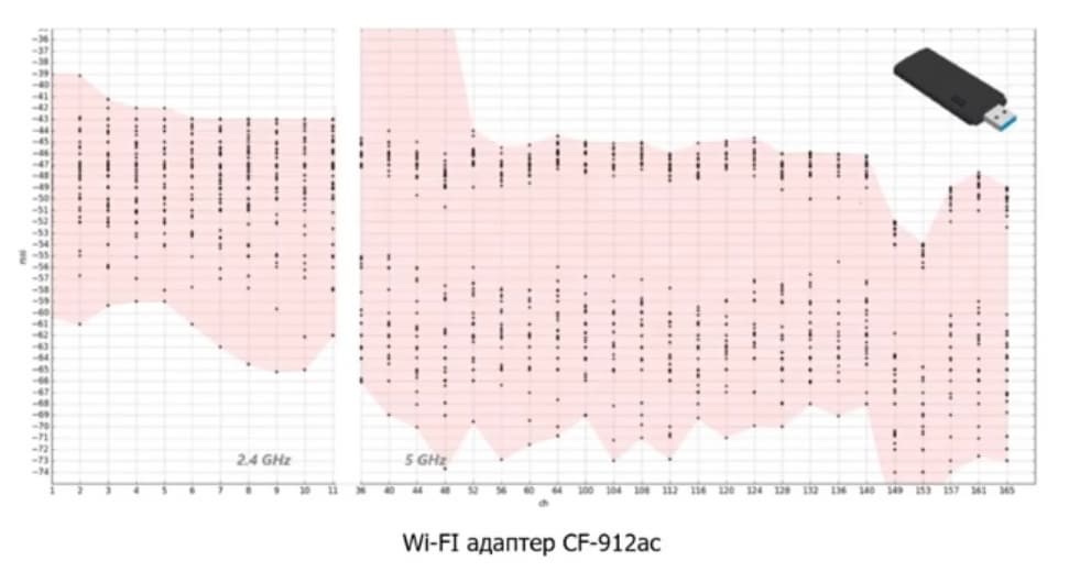 Разница между нижним и верхним значениями здесь существенно меньше. Тем не менее, все равно есть небольшие изменение для разных каналов. Устройство по-разному слышит на разных каналах. Нужно это учитывать при планировании сети, но медианная составляющая достаточно ровная, она одна из лучших на рынке. Обычные адаптеры не выдерживают сравнения с ней.