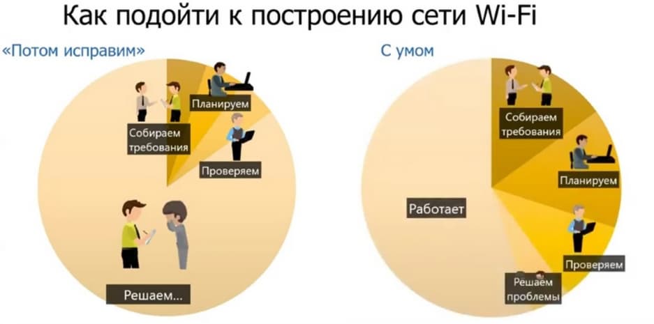 Далее пошла речь про этапы построения сети. (Тут небольшой фокус сделан в сторону обустройства складов.) Начинать надо с составления технических требований к проектированию сети. Неправильно думать, что Wi-Fi должен покрывать 100% площади объекта. Надо понимать где, зачем и для кого, для каких девайсов строится Wi-Fi-сеть. Вот план последовательности действий при построении сети.