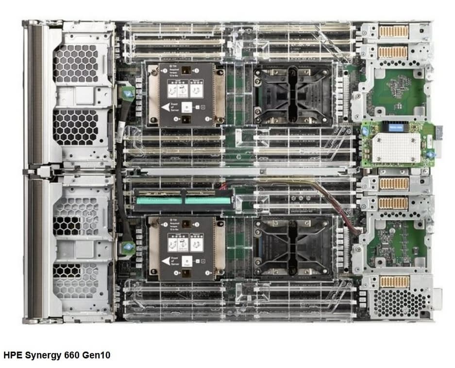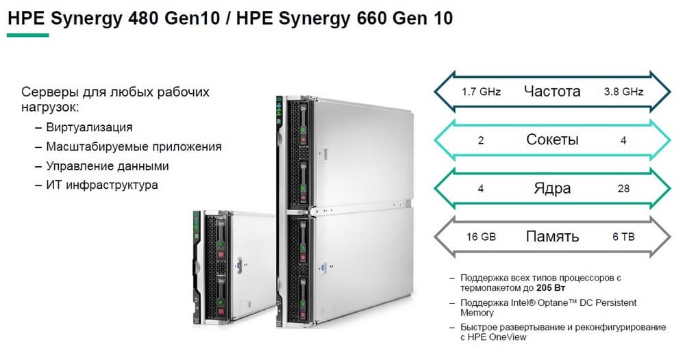 Двухпроцессорные северы HPE Synergy 480 Gen10 и четырехпроцессорные HPE Synergy 660 Gen10 имеют на своем борту процессоры Intel Xeon Scalable (до 28 ядер) и память DDR4 объемом до 3 Тбайт (для HPE Synergy 480) и до 6 Тбайт (для HPE Synergy 660), систему хранения данных повышенной емкости и большое количество контроллеров. Типы дисков: HDD или SSD малого форм фактора, SSD типоразмера micro; NVMe SSD; USB и microSD.