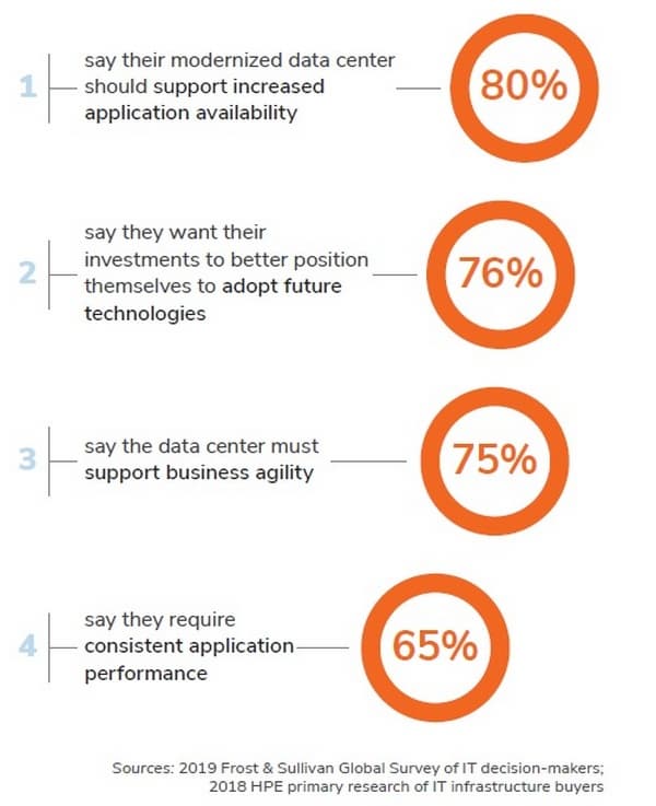 По данным компании Forrester Consulting для ИТ-руководителей модернизация ЦОДа означает привнесение гибкости и новой функциональности. Когда они двигаются по пути модернизации, они не видят необходимости в «Копировании и замене» аппаратного и программного обеспечения ЦОДа. Они планируют перейти к последним моделям развертывания и архитектуры, таких как частное облако или программно-определяемые ЦОДы. ИТ-руководители ожидают, что инфраструктура следующего поколения будет более гибкой, масштабируемой и простой в интеграции, обслуживании и управлении, чем предыдущие поколения.