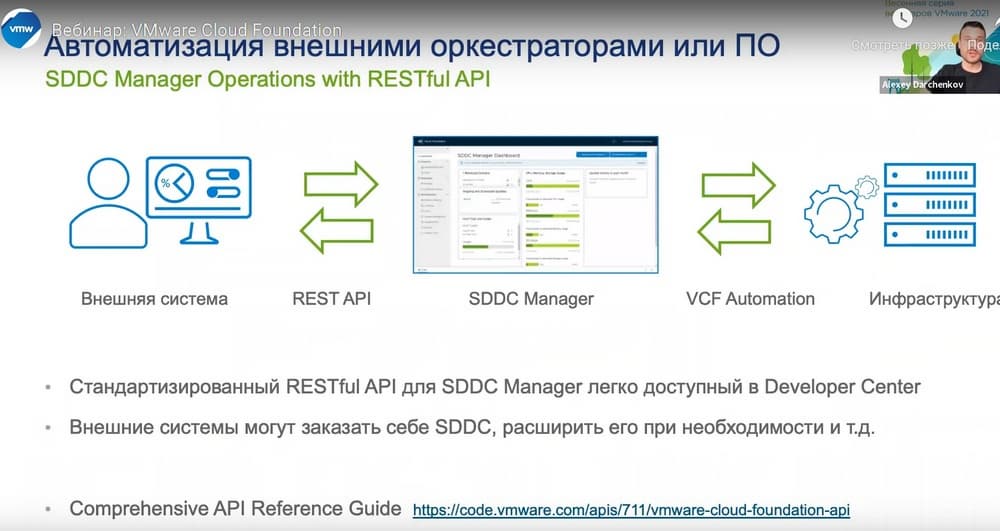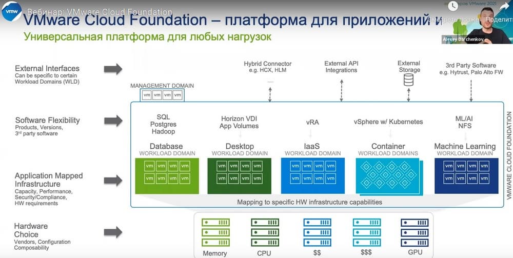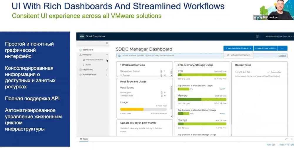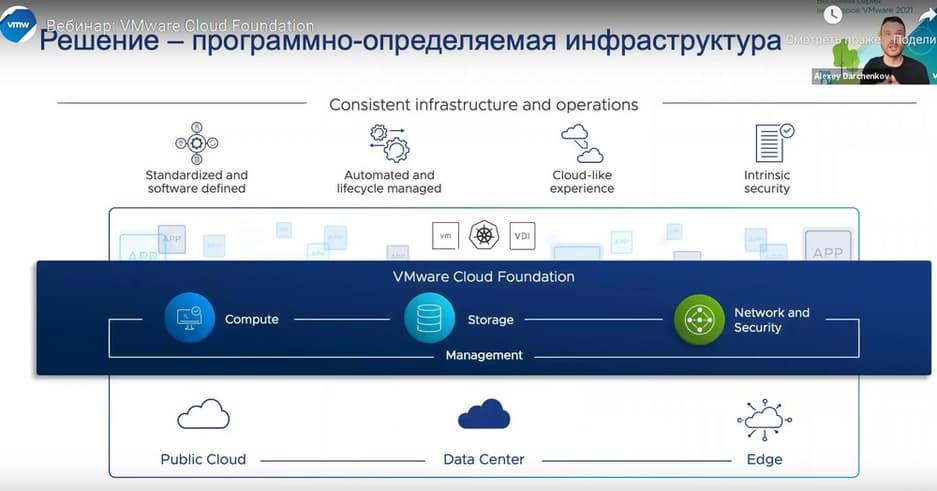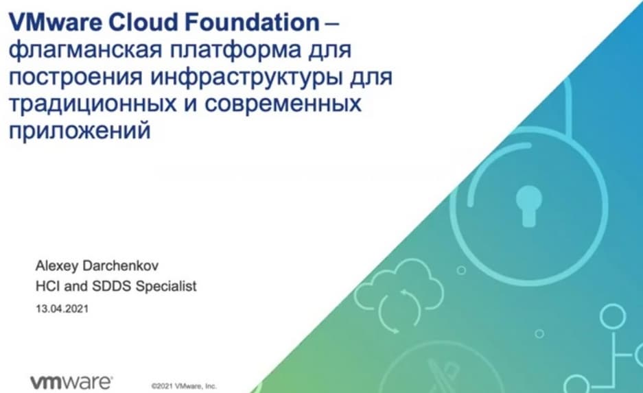 Сегодня Алексей Дарченков, специалист по гиперконвергентным систем и программно-определяемым системам компании VMware в России, проведет презентацию «VMware Cloud Foundation — флагманская платформа для построения инфраструктуры для традиционных и современных приложений», на которой он расскажет об архитектуре и возможностях флагманской платформы для построения программно-определяемого ЦОД от VMware.