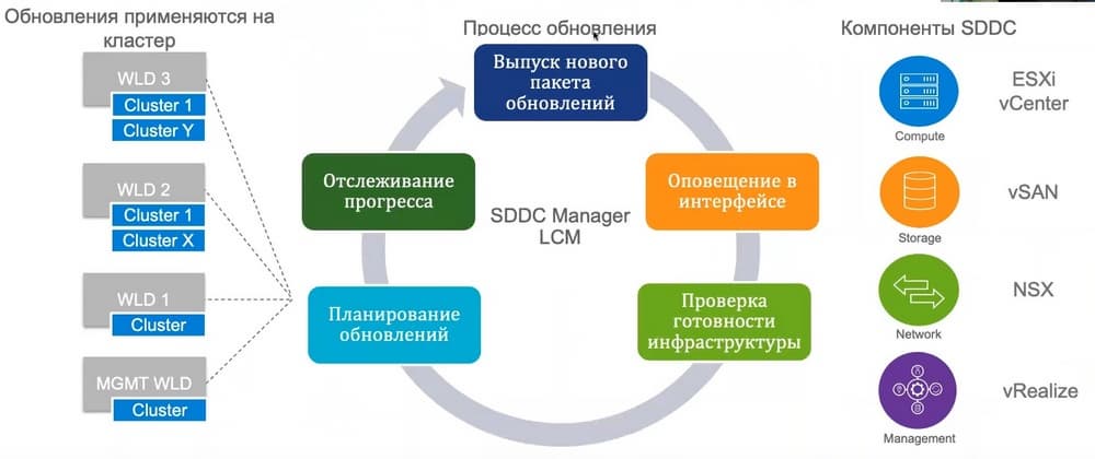 Если говорить о Lificycle Management, то на этот пункт стоит обратить особое внимание, это большое преимущество VMware Cloud Foundation. Здесь происходит обновление не на базе каждого компонента в отдельности, а всей инфраструктуры в целом.