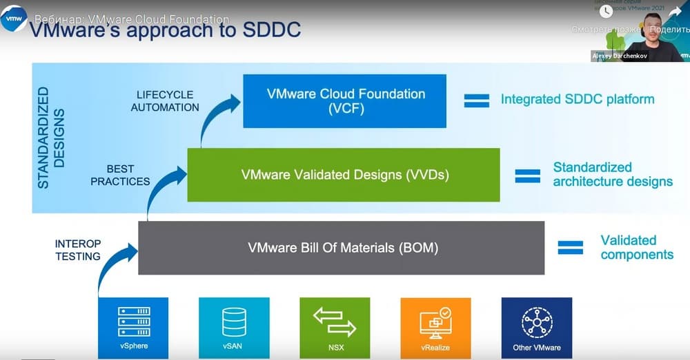 К сожалению, не у всех получается самостоятельно построить инфраструктуру на продуктах этого вендора. Для помощи в этом VMware создал свод документов – VMware Validated Designs (VVDs), он есть в Интернете, его там можно прочитать. Этот свод иногда смотрят как энциклопедию, когда нужно принять то или иное решение. В результате вендор для автоматизации создал решение VMware Cloud Foundation, которое позволяет управлять жизненным циклом ПО и строить инфраструктуру правильно в соответствие с VMware Validated Designs. Что входит в VMware Validated Designs?