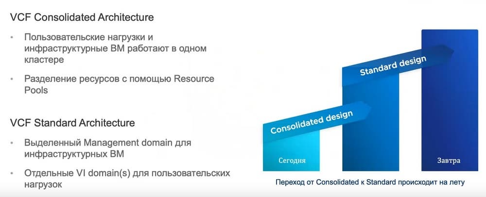 Consolidated архитектура и Standart архитектура. В случае Consolidated архитектуры пользовательские нагрузки и инфраструктурные ВМ работают в одном кластере, а разделение ресурсов осуществляется с помощью Resource Pools. В случае же стандартной архитектуры есть отдельный management кластер и отдельный кластер для пользовательских нагрузок, это уже полноценный Deployment для больших площадок.