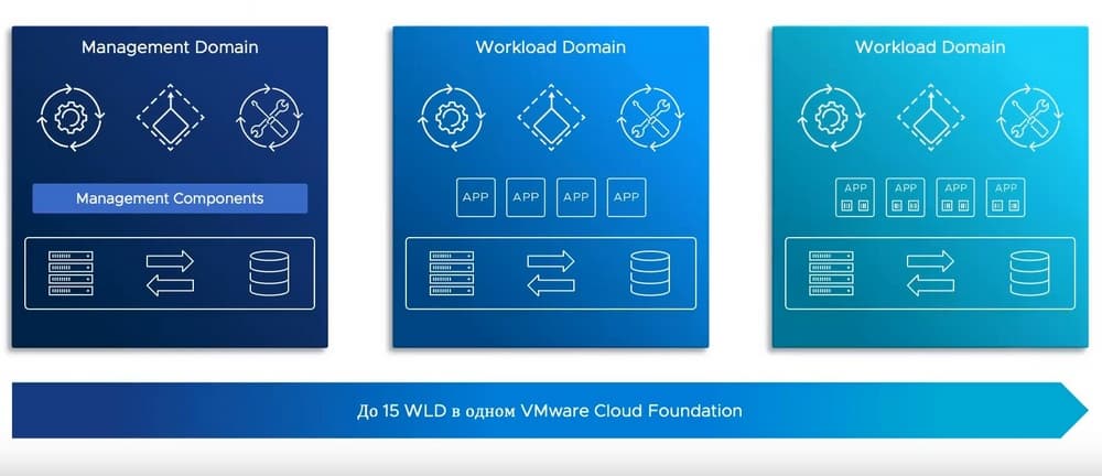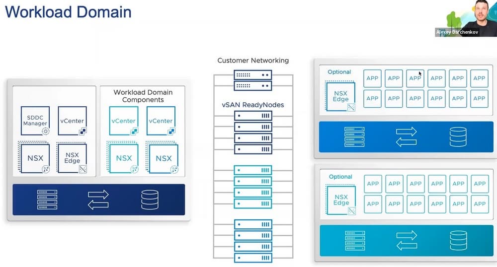 Основной архитектурный компонент VMware Cloud Foundation – это Workload Domain, это изолированный домен ресурсов, где есть вычислительные и сетевые ресурсы, предоставленные на базе NSX и ресурсы хранения данных на базе vSan или внешнего СХД.