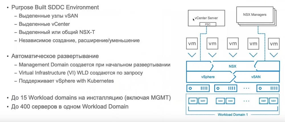 Workload Domain – это отдельный vCenter со встроенным платформ-сервис контроллером, отдельные NSX менеджеры, storage vSAN, либо какой-то внешний storage.