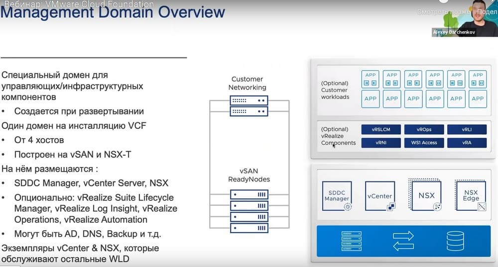 Если говорить чуть подробнее, то есть отдельный Management Domain, где «живут» management компоненты, это прямая аналогия с management кластером в стандартной архитектуре центра обработки данных.