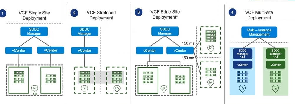 Это может быть как обычный Single Site Deployment (см. предыдущий слайд), это самое простое, ее внедряют бОльшая часть клиентов, также поддерживаются катастрофоустойчивые решения – растянутые кластеры на базе vSAN. Поддерживается также Edge Site Deployment. Если есть центральный ЦОД и какое-то количество филиалов, то требования для филиалов достаточно гуманные – 150 ms. Значит это можно внедрить и этим пользоваться. Вся управляющая инфраструктура в центральном ЦОДе, а непосредственно кластеры могут быть на площадках, в магазинах, цехах, есть много разных вариантов применения. Если в качестве storage используется vSAN, и если отключится vCenter, то vSAN полностью независим от него. Для особенно больших инсталляций поддерживается Multi-Site Deployment, когда можно объединить несколько SDDС Manager в одну инфраструктуру и видеть все ресурсы из одного окна (см. следующий слайд).