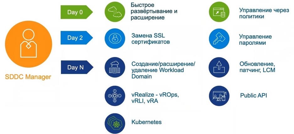 Он занимается развертыванием инфраструктуры и ПО в соответствии с лучшими практиками, установкой обновлений и исправлений, а также масштабированием инфраструктуры. Он занимается правильной настройкой среды и разделением ресурсов на Workload Domain, установкой каких-то дополнительных компонентов, инициализацией дополнительных ресурсов: если появляются еще серверы, их можно добавить в тот или иной Workload Domain, если нужно уменьшить Workload Domain, то можно вытащить из него сервер с помощью SDDС Manager. Важный пункт – установка, исправление и обновление, здесь это происходит не так как в обычной инфраструктуре.