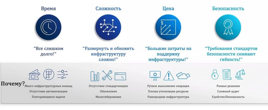 О чем сегодня просят администраторы инфраструктуры: чтобы все было сделано быстро, чтобы ничего не ломалось, все было дешево и безопасно. На предыдущем слайде отображены четыре проблемы, которые можно решить с помощью VMware Cloud Foundation. Это слишком долгое развертывание инфраструктуры и ее высокая сложность, которая начинается на стыке систем и отдельных продуктов системы. Цена: очень велики операционные затраты на поддержку сложной гетерогенной инфраструктуры, для этого нужно много разных отделов и специалистов. Что касается безопасности, то на базе VMware Cloud Foundation можно проще реализовать требования по безопасности.