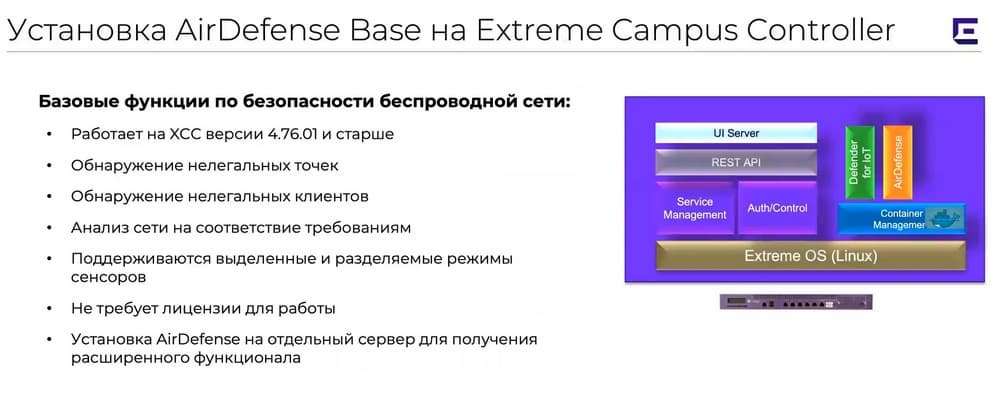 Это решение поддерживает контейнерную архитектуру и в качестве одного из контейнеров может устанавливаться не совсем полный пакет Extreme AirDefense, это AirDefense Base, который не требует дополнительного лицензирования. Если этого функционала недостаточно, можно докупить полный пакет.