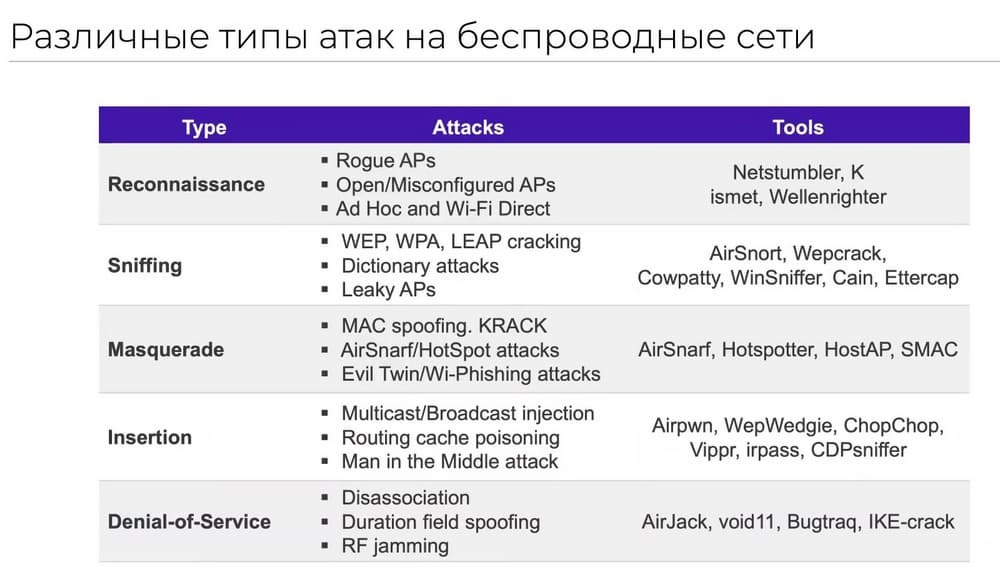 - Основных уязвимостях и типах атак, встречающихся в беспроводных сетях;