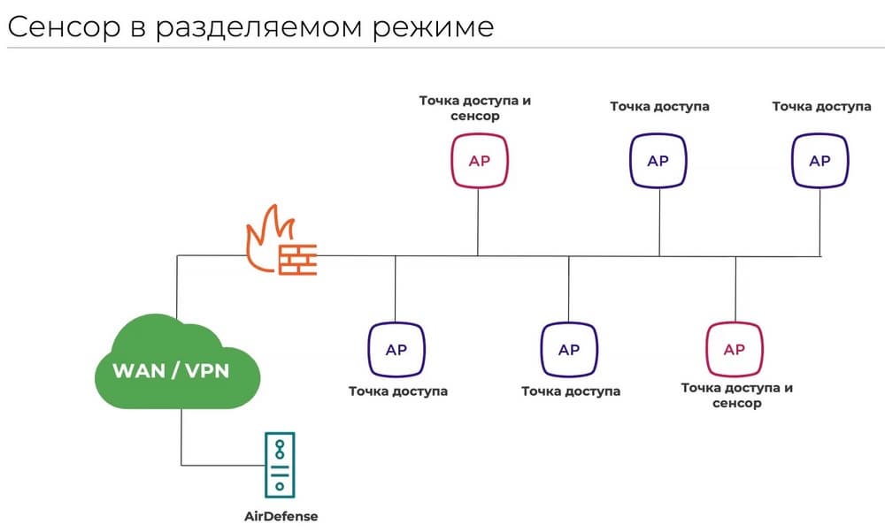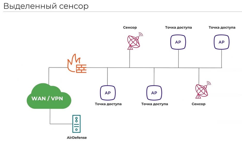 Сенсоры работают как в выделенном режиме, так и в разделяемом режиме. Есть в системе также корпоративные точки доступа и коммутаторы. Коммутаторы присутствуют не только потому что они связывают многие компоненты между собой, но они являются важным компонентом при работе системы предотвращения атак.