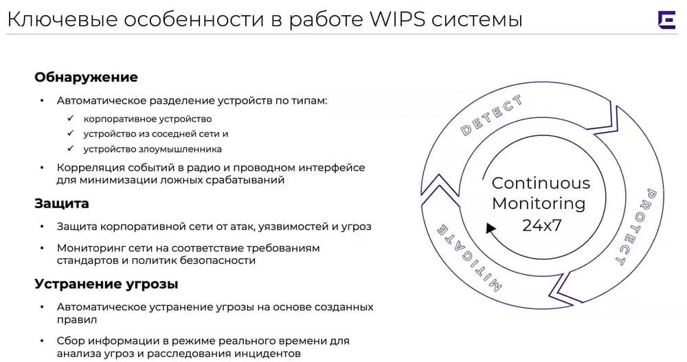 Еще одна немаловажная задача в рамках защиты беспроводной инфраструктуры – это мониторинг сети на соответствие политикам ИБ безопасности. Такие события нужно обнаруживать и о них уведомлять сетевую администрацию или сотрудника ИБ.
