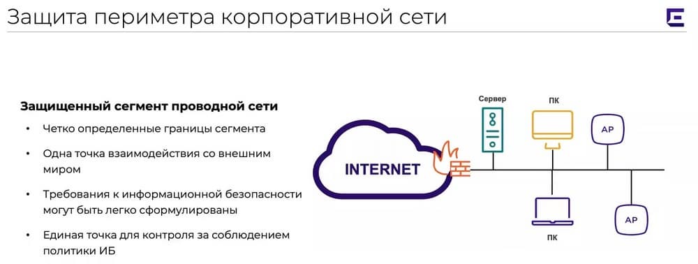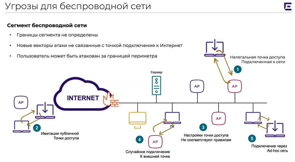 Становится понятно, что периметр сети это уже не точка подключения к Интернету, а в случае беспроводного решения таких точек становится много, значит появляется множество потенциальных угроз.