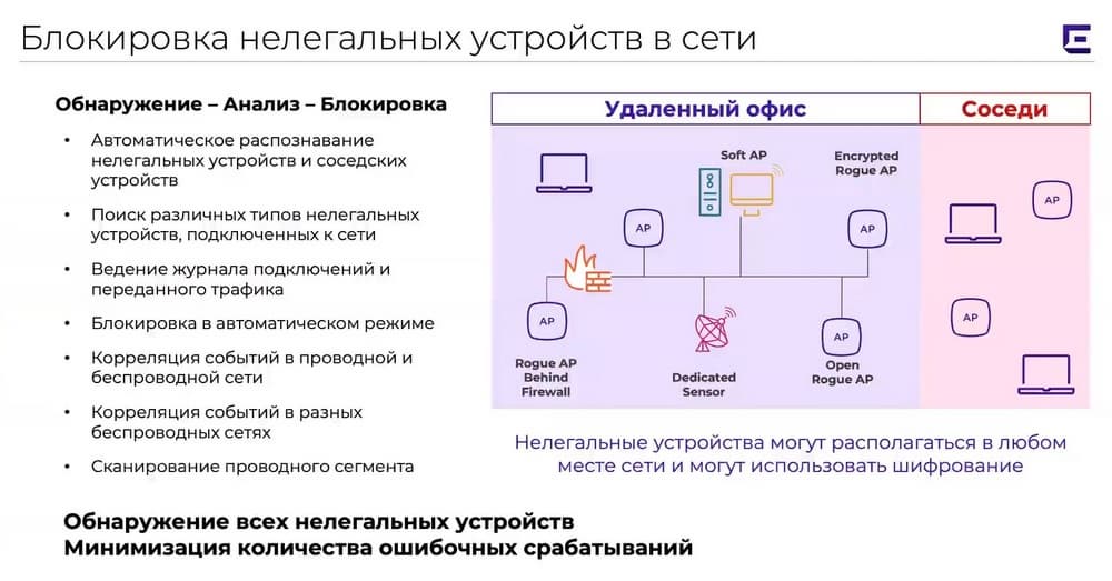 Помогает этой классификации различные алгоритмы, которые реализованы в системе и которые занимаются корреляцией событий и которые система видит в радиоинтерфейсе и проводном интерфейсе. За счет анализа этих событий и происходит обнаружение потенциальных угроз и их дальнейшая блокировка.