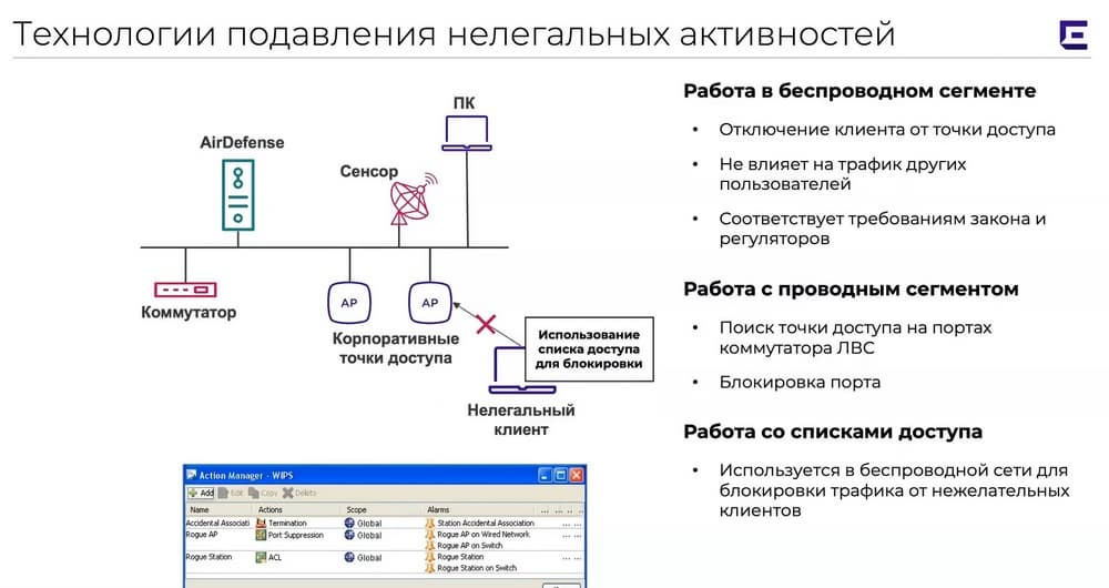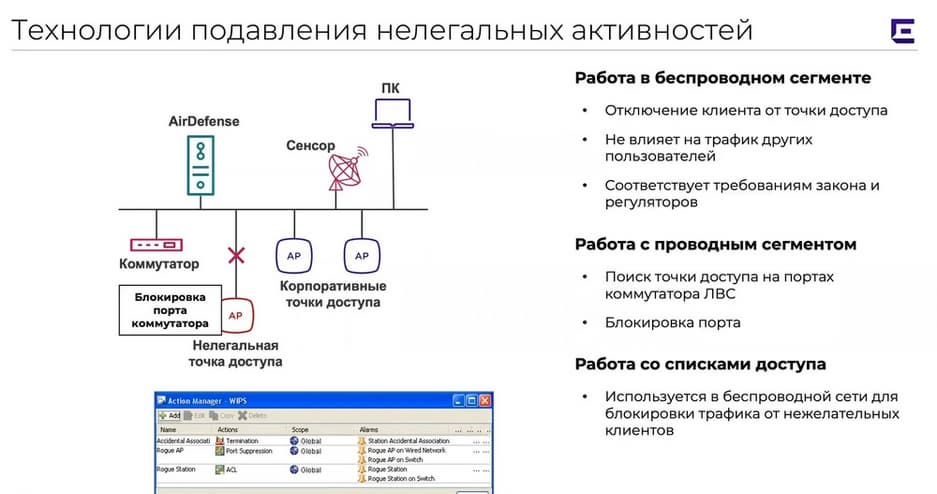 Для такого решения доступно только возможность работы с беспроводным сегментом и с различными беспроводными блокировками. К сожалению, это не всегда достаточно. AirDefense умеет интегрироваться и с проводной сетью. Что может сделать система, если она обнаружит, что корпоративный пользователь подключился к точке доступа соседей. Система AirDefense может такое событие отследить, уведомить об этом администратора, если настроено автоматическое таких событий, то сенсор вмешается и отключит клиента от точки доступа.