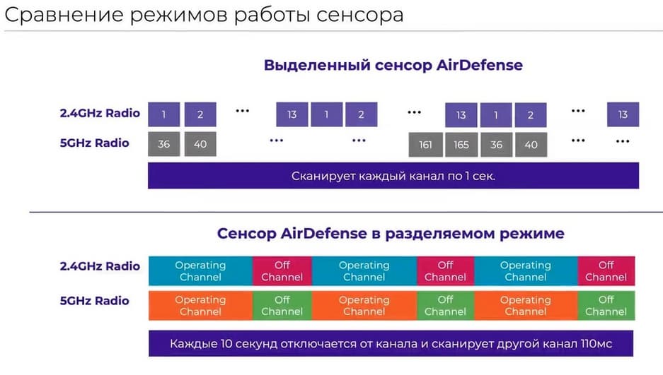 Сенсору в разделяемом режиме приходится комбинировать две роли. Понятно, что в таком режиме страдает качество. Если у этой точки нет сейчас задачи обслуживания клиентского трафика, она может отключиться от канала, и провести сканирование другого канала, она перебирает тот же самый список каналов, но делает это по очереди и делает это в интервалах, когда она свободна от обслуживания клиентов. Если угроза достаточно долговременная, то сенсор в таком режиме тоже обнаружит уязвимость.