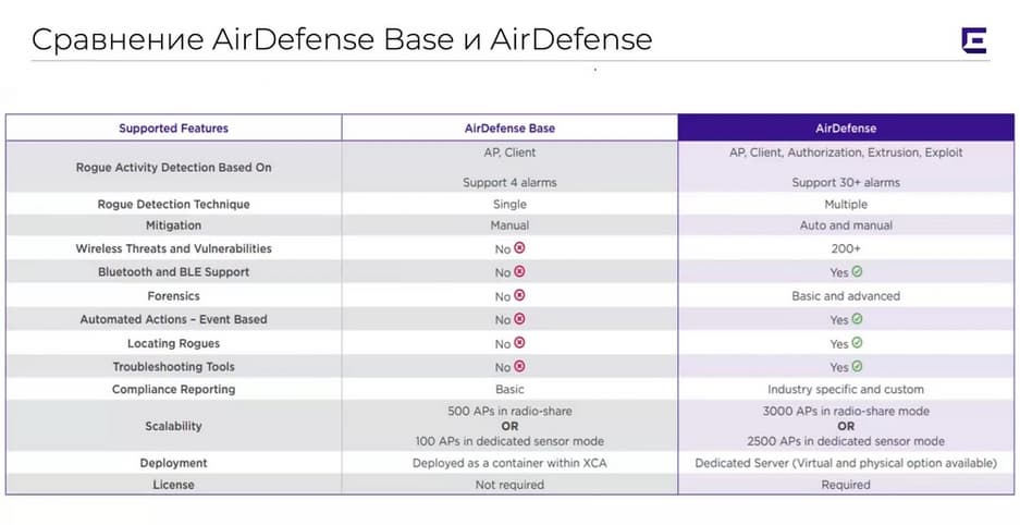 На следующем слайде представлены отличия AirDefense Base и AirDefense.