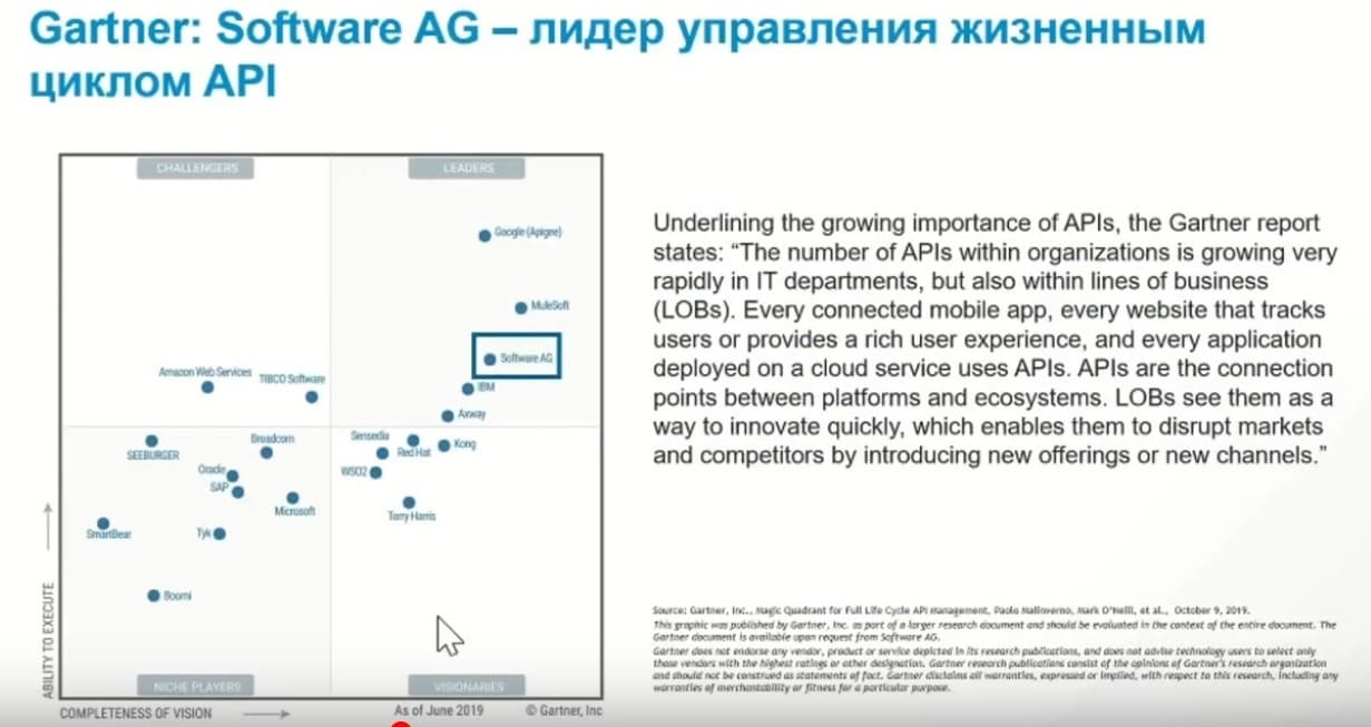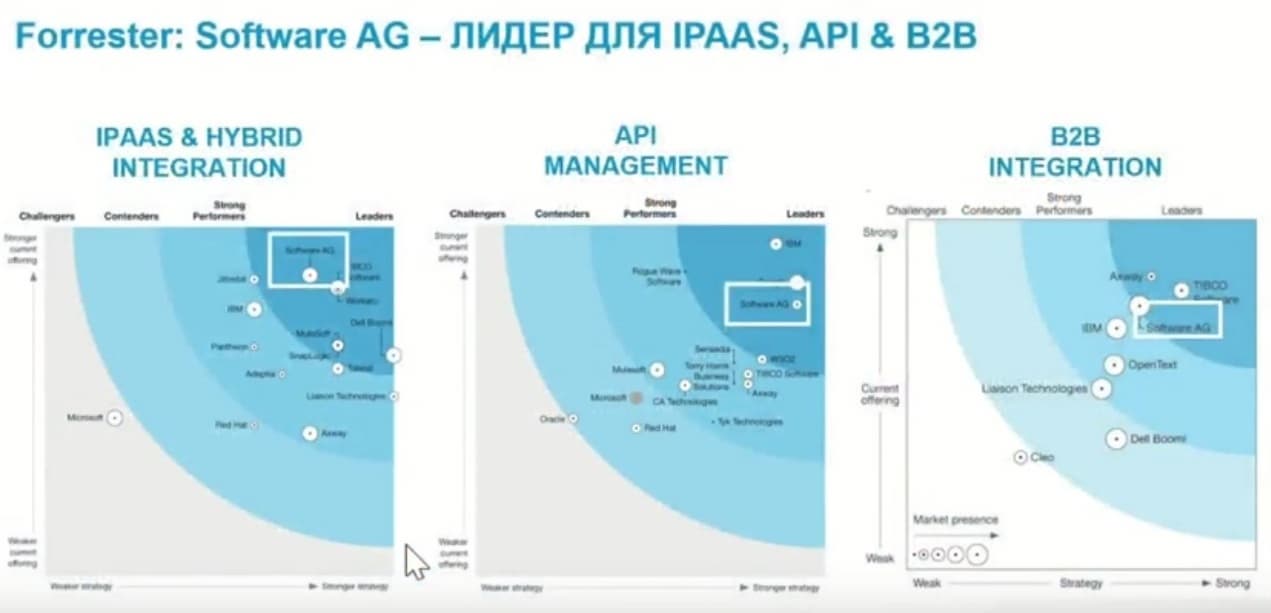 Software AG – это одна из старейших компаний, которая занималась исключительно разработкой программного обеспечения, она была образована в 1969 году, Основная цель этой компании – это разработка технологий для бизнеса. Компания интенсивно занимается расширением партнерской сети, работая с таким компаниями, как Dell, Microsoft, Amazon. Этот вендор занимает ведущее место в области Индустрии 4.0 и промышленном Интернете вещей. У Software AG уже более 10 000 заказчиков в более чем в 70 странах. Один из основных трендов, которым занимается вендор, это помощь заказчикам найти современный подход к интеграции.