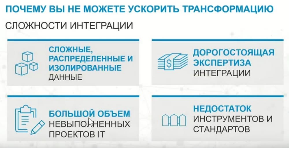 Поскольку системы в значительно степени, особенно унаследованные, являются сложными, а с другой стороны, системы становятся распределенными, но не решают проблему изолированности данных. Для того, чтобы реализовывать такие проекты, необходимы новые инвестиции, дорогостоящие экспертизы, интеграция. И в то же время накапливается объем невыполненных проектов ИТ. В частности, объясняется это тем, что не хватает инструментов и стандартов. И все это приводит к тому, что сама трансформация происходит медленно.