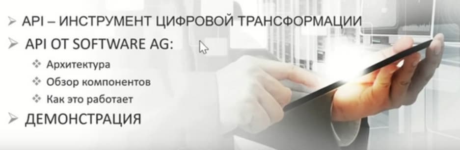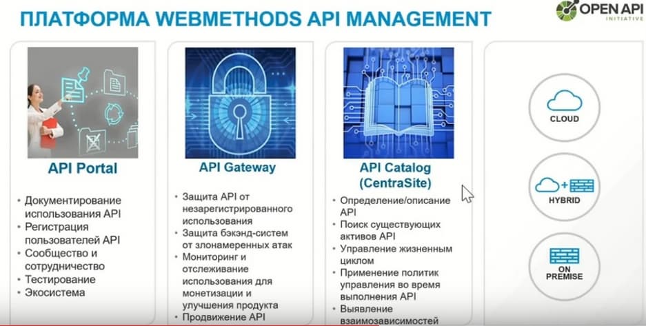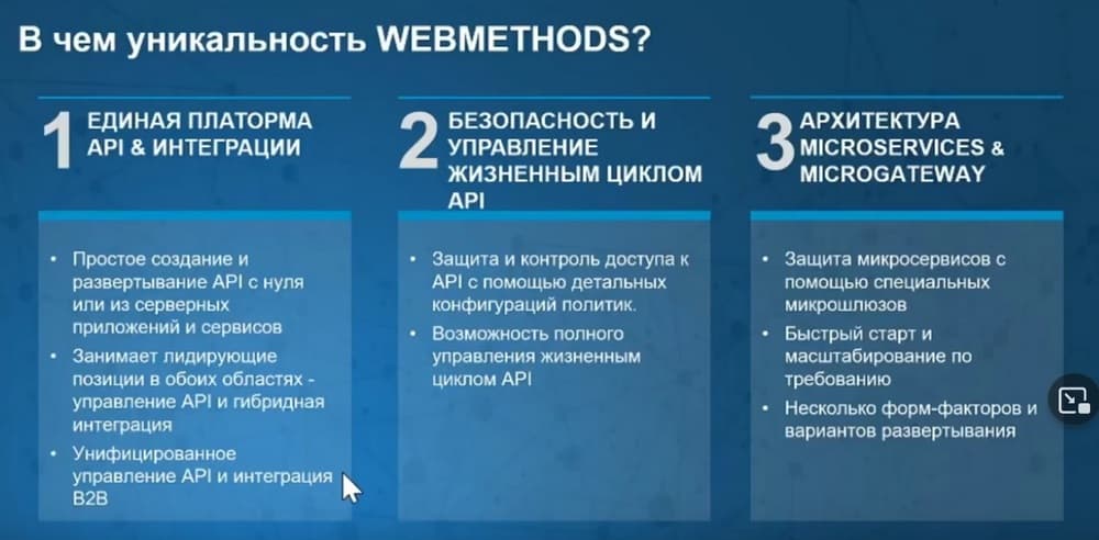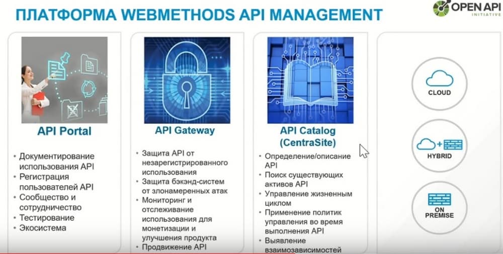 Прежде всего, это единая платформа API и ее интеграция. И более того, Gartner, оценивая возможности WEBMETHODS, сказал, что WEBMETHODS и API - это две стороны одной медали. Что, говоря об интеграции, нельзя не говорить об API, и, наоборот, говоря об API нельзя не говорить об интеграции.